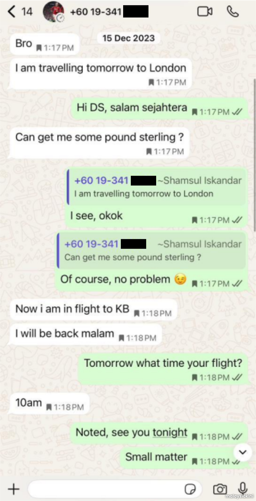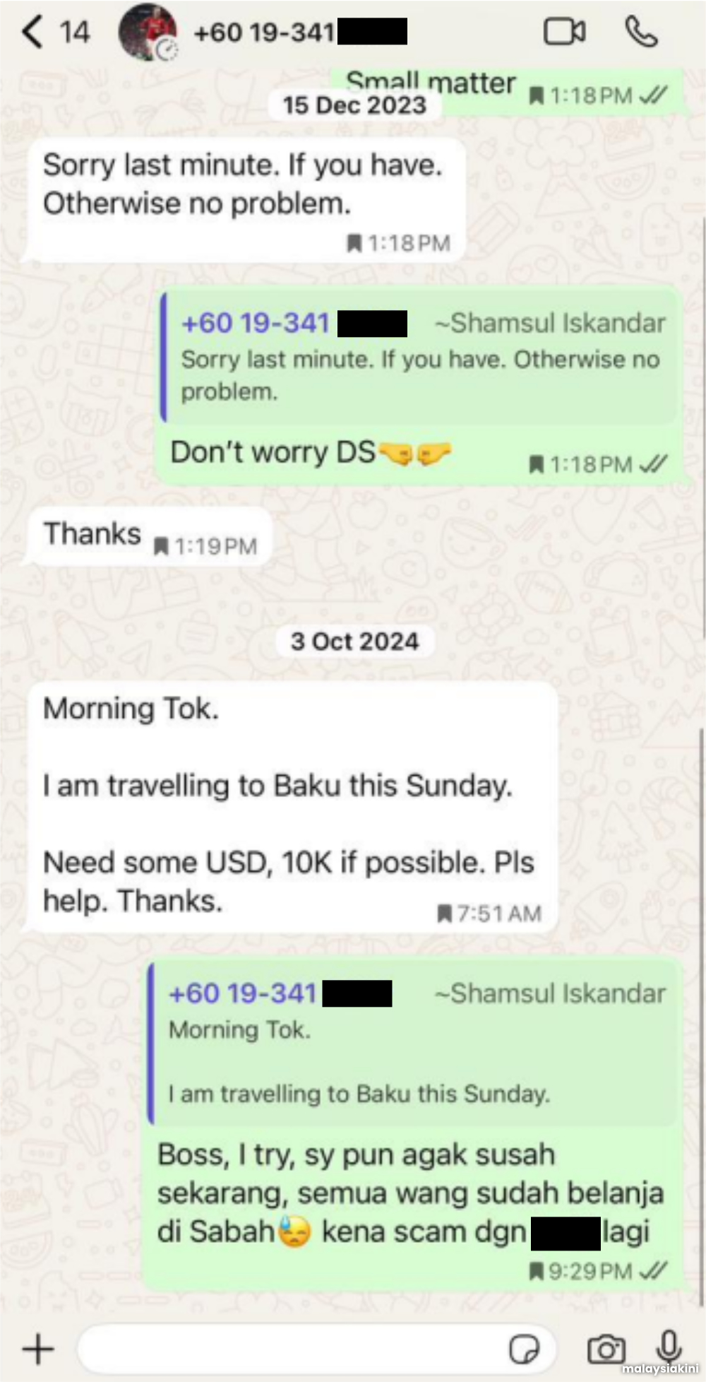 Tei juga menunjukkan tangkapan skrin WhatsApp dari Disember 2023, di mana Shamsul didakwa meminta wang kepadanya semasa berada di luar negara.